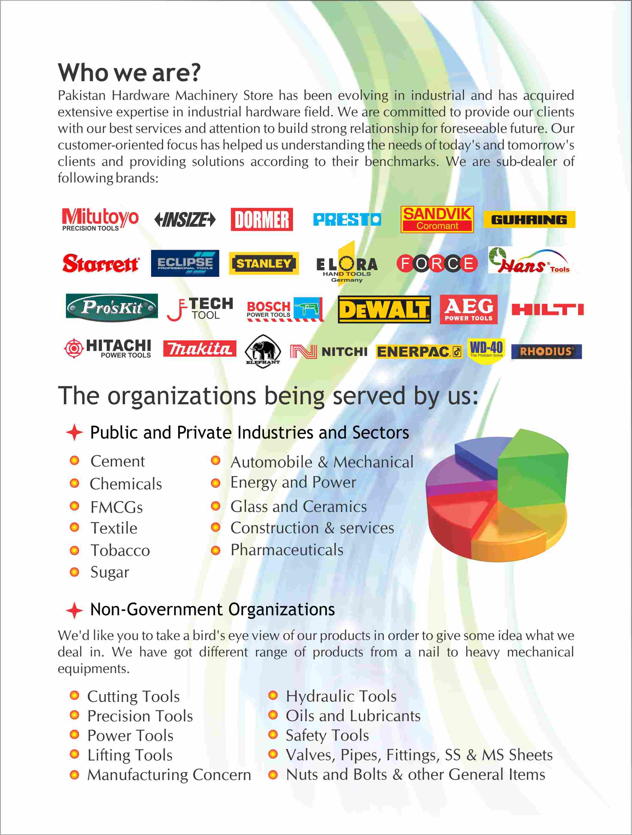 Pakistan Hardware Machinery Store has been evoling in industrial and has acquired exte nsive expertise in industial hardware field. We are commited to provide our clients with our best services and attention to bulid strong relationship for foreseeable future. Our customer-oriented focus has helped us understanding the needs of today's and tommorrow's clients and providing solutions accroding to their benchmarks. We are sub-dealer of following brands.